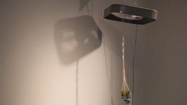 Hardware, vinyl blinds, window fan, macrame, house plant, cat toy. 2017.